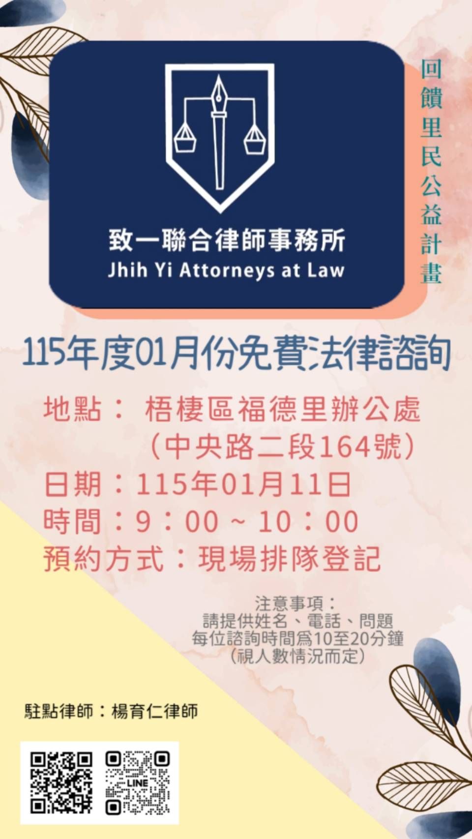 115年度1月份法律諮詢時間公告