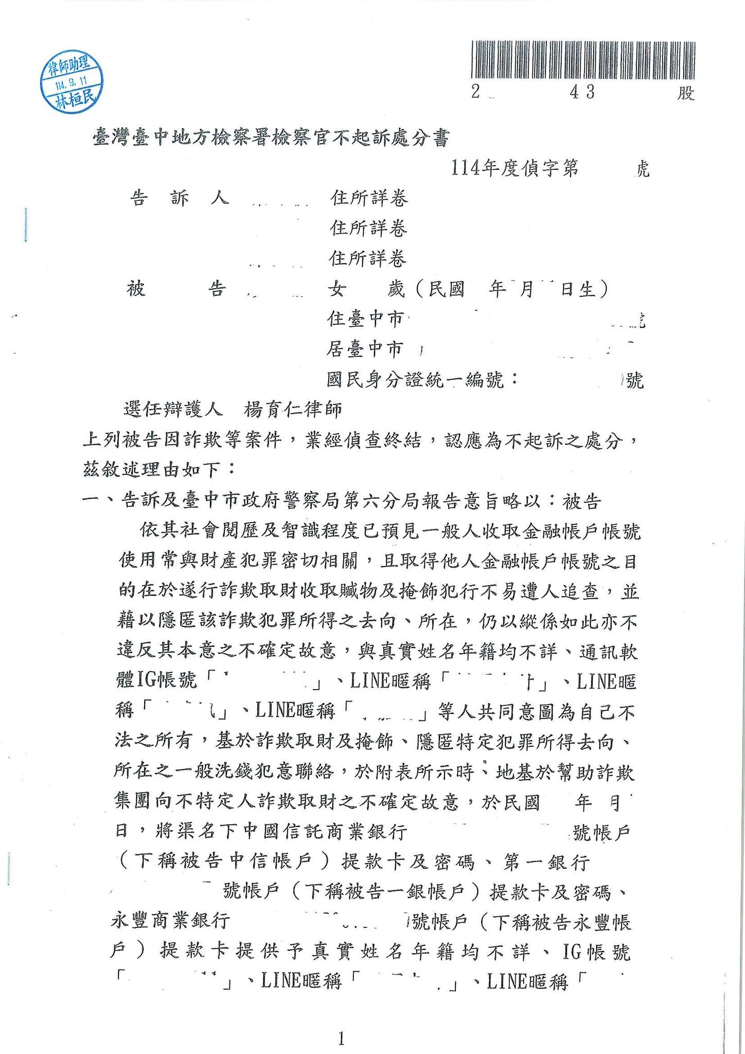 被騙帳戶收到傳票?洗錢案件獲得不起訴處分
