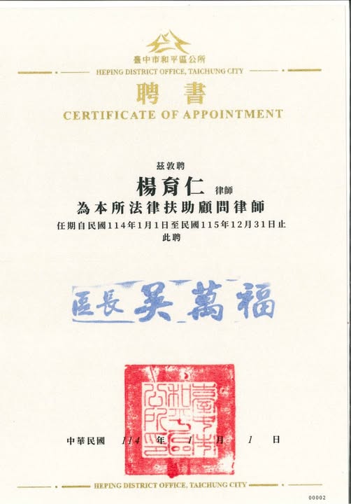 本律師事務所楊育仁律師獲聘臺中市和平區公所法律扶助顧問律師