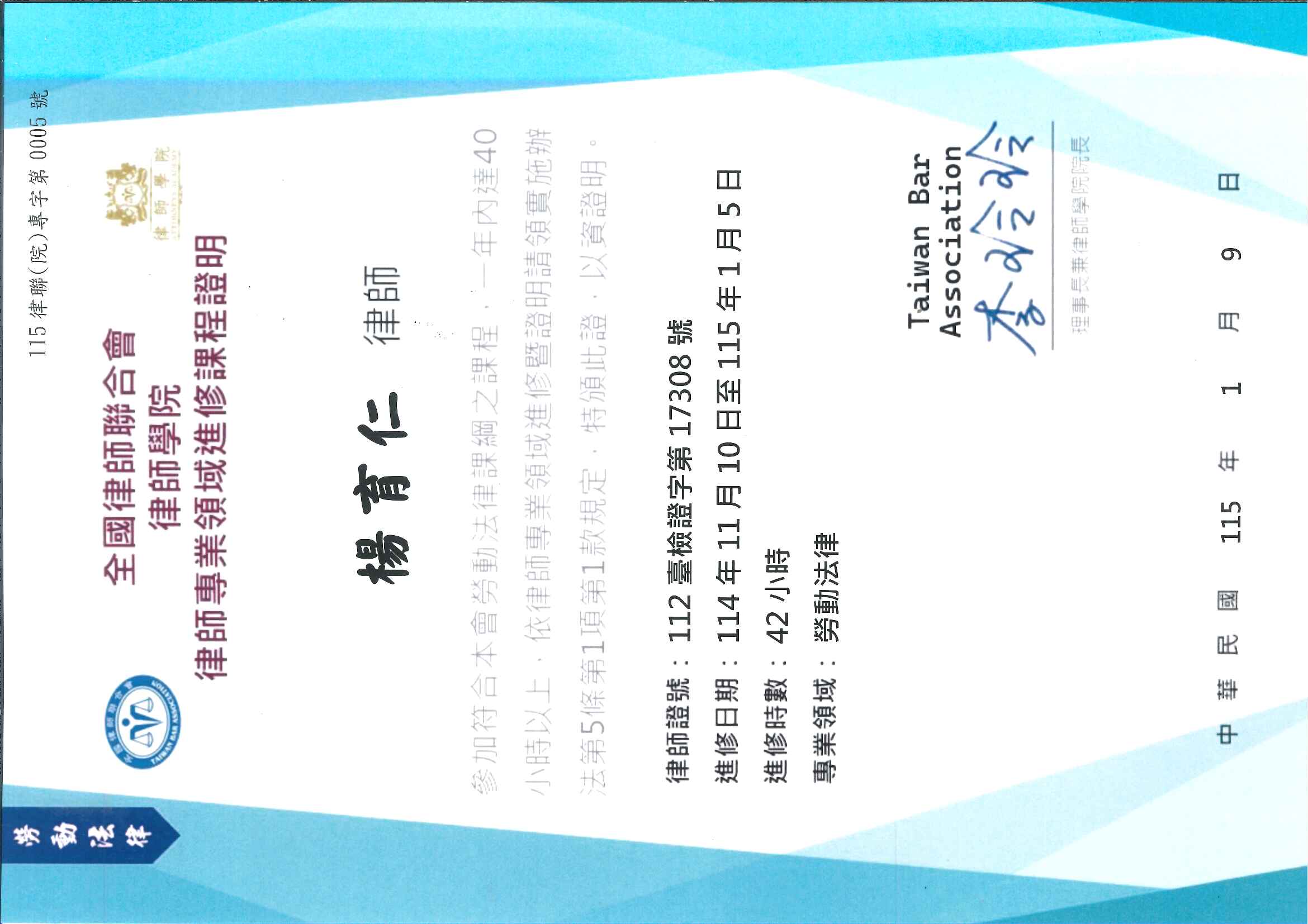 本律師事務所楊育仁律師獲全國律師聯合會核發勞動律師專業證明